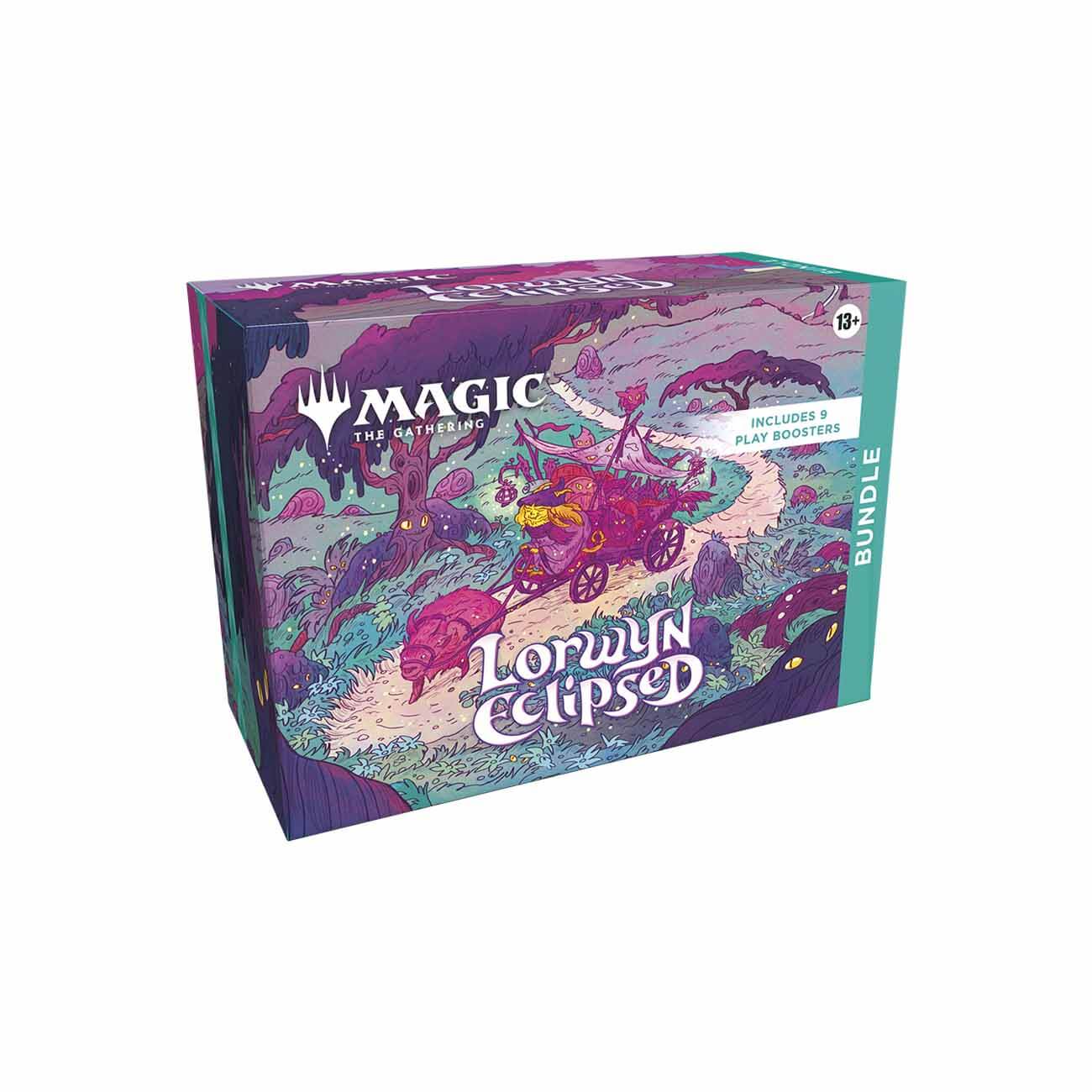 Коллекционный набор (bundle) издания Lorwyn Eclipsed на английском языке для игры Magic: the Gathering (MTG / МТГ) включает в себя 9 игровых бустеров (play boosters), 1 счётчик жизней, 30 базовых земель - 15 фойловые / 15 обычные, 1 фойловую промо карту с альтернативным артом, 2 справочных карты и коробку для хранения карт.