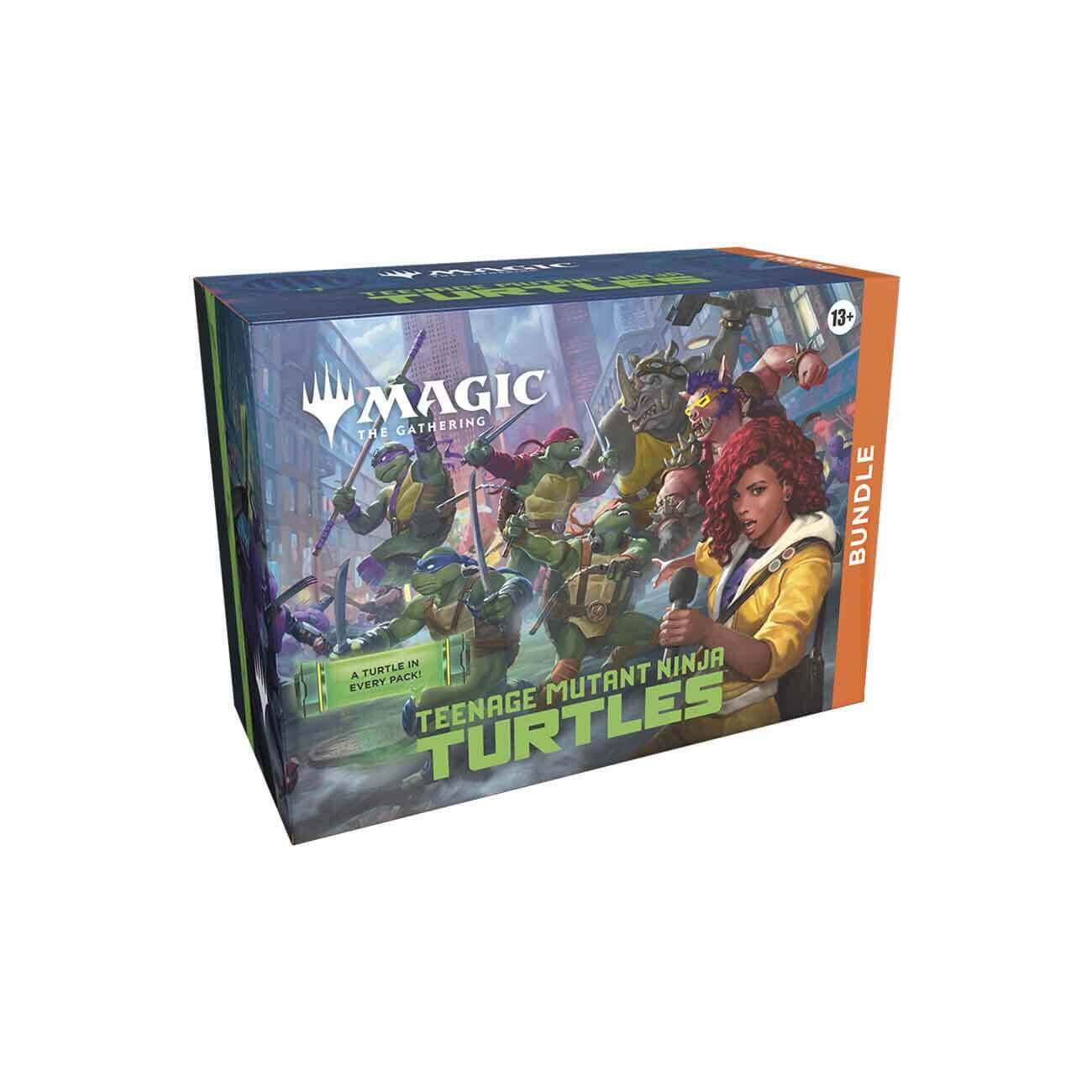 Коллекционный набор (bundle) издания Teenage Mutant Ninja Turtles на английском языке для игры Magic: the Gathering (MTG / МТГ) включает в себя 9 игровых бустеров (play boosters), 1 счётчик жизней, 30 базовых земель - 15 фойловые / 15 обычные, 1 фойловую промо карту с альтернативным артом, 2 справочных карты и коробку для хранения карт.