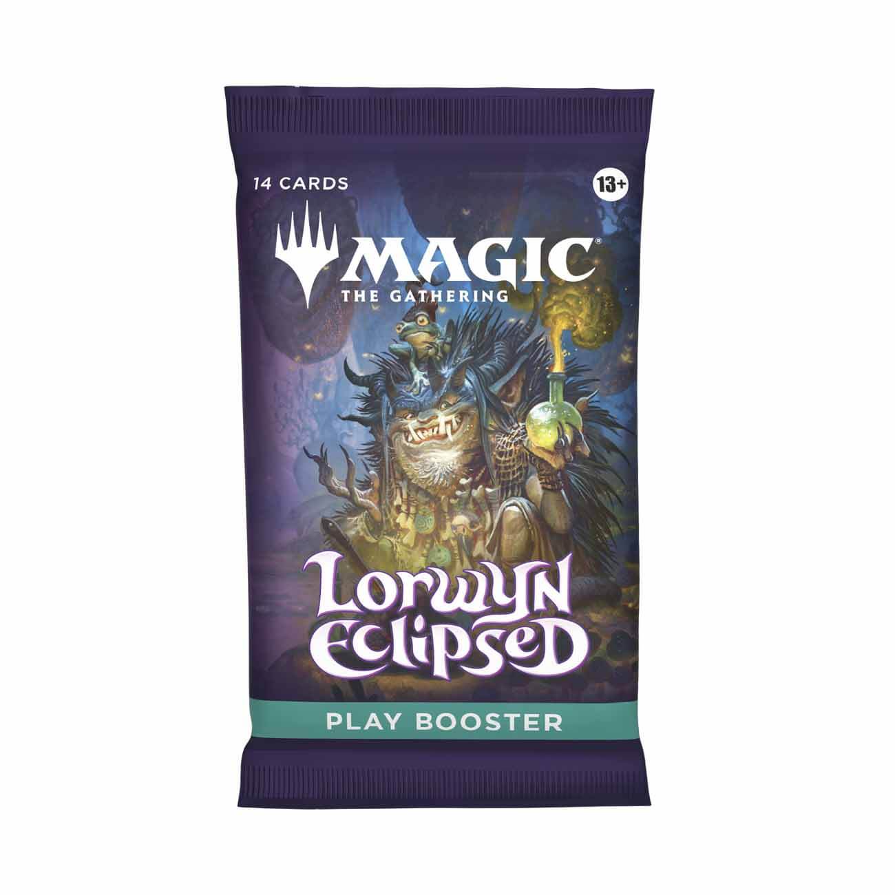 Игровой бустер (play booster pack) издания Lorwyn Eclipsed на английском языке содержит 14 случайных карт Magic: the Gathering (MTG / МТГ) в том числе: 6-9 обычных (common) карт, 3-5 необычных (uncommon) карт, 1 базовую землю (basic land) с вероятностью 20% фойловую, 1-4 редких и/или мифических карт, минимум 1 блестящую (фойловую) карту. Есть также вероятность найти в бустере карту из специального издания репринтов Special Guests.