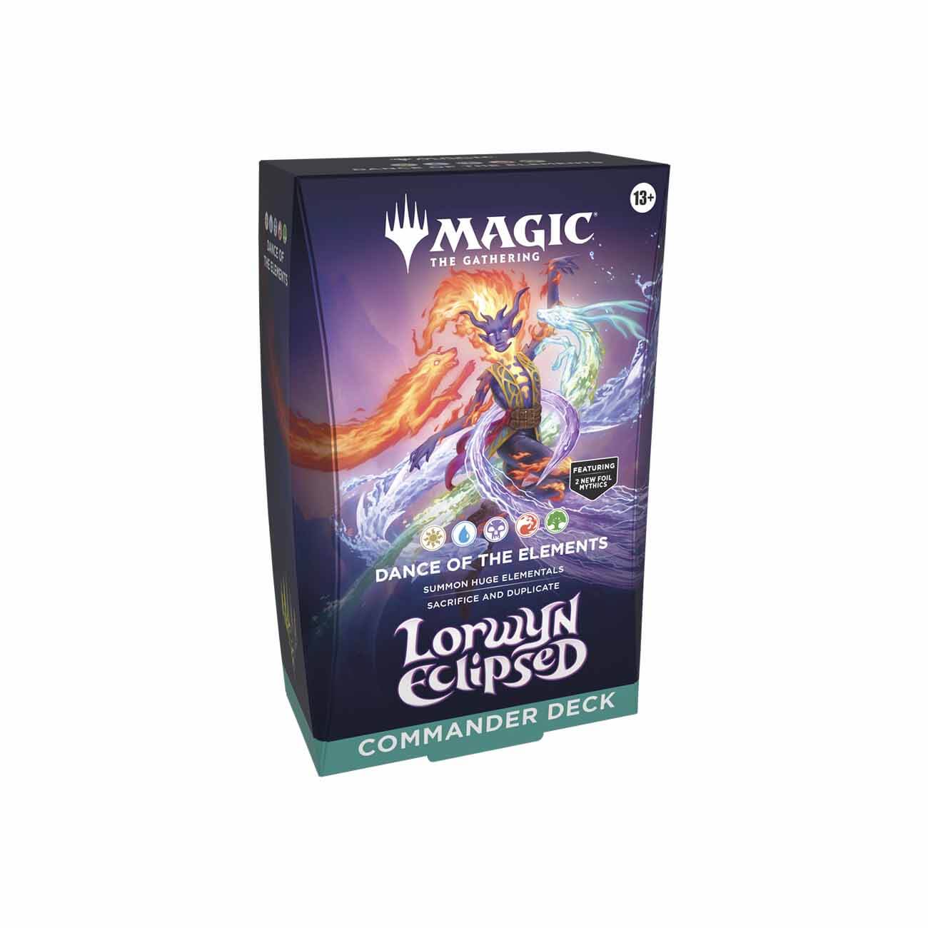 100-карточная 5-цветная колода Dance of the Elements на английском языке для формата Commander (Командир), построенная вокруг темы баланса всех элементов природы и света для победы над тьмой, издание Lorwyn Eclipsed, игра Magic: the Gathering (MTG, МТГ). В состав также входят коробка для колоды, 10 двусторонних токенов (жетонов), 2 фойловых (блестящих) карты и справочный буклет.