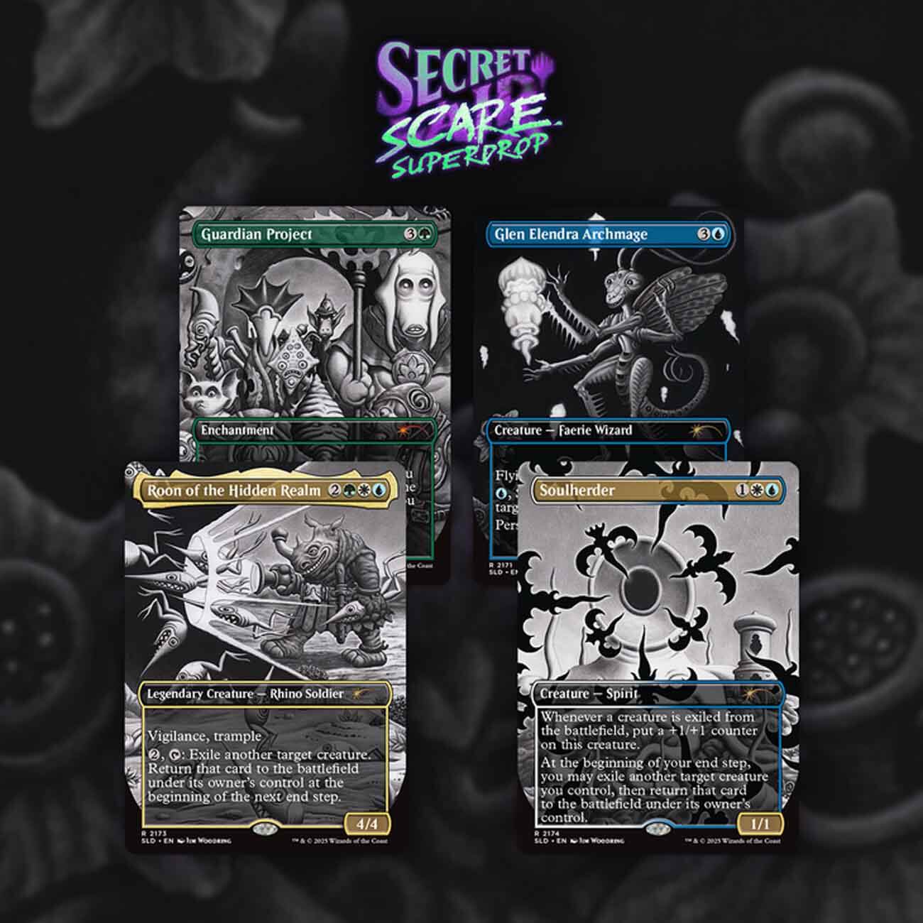 Специальный набор ограниченного тиража Secret Lair Dreaming Darkly включает 4 карты Magic: the Gathering (MTG / МТГ) на английском языке, каждая с уникальным полноформатным артом в форме сюрреалистических рисунков, выполненных тушью и пером: Glen Elendra Archmage; Guardian Project; Roon of the Hidden Realm; Soulherder. Художник-автор иллюстраций: Jim Woodring.