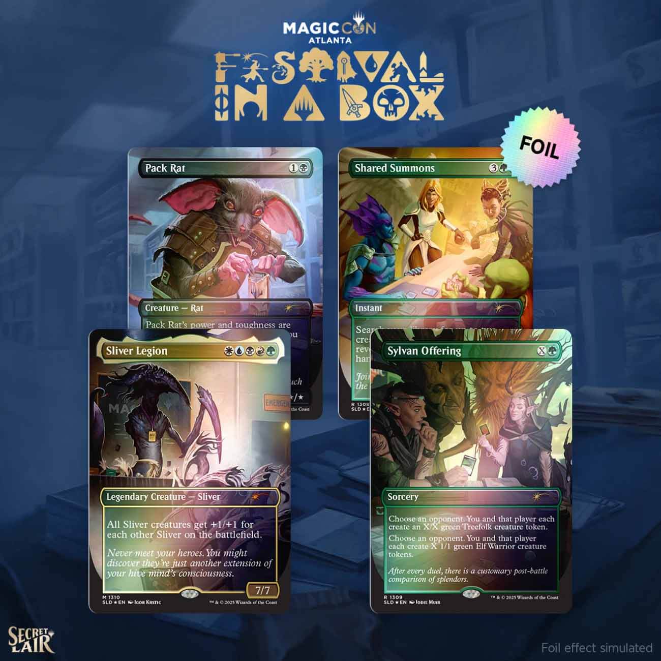 Специальный набор ограниченного тиража Secret Lair MagicCon: The Gathering Foil Edition, включает 4 карты Magic: the Gathering (MTG / МТГ) на английском языке в фойловом (блестящем) исполнении, каждая с уникальным полноформатным артом: Pack Rat, Shared Summons, Sylvan Offering, Sliver Legion. Художники-авторы иллюстраций: Leonardo Santanna, Jodie Muir и Igor Krstic.
