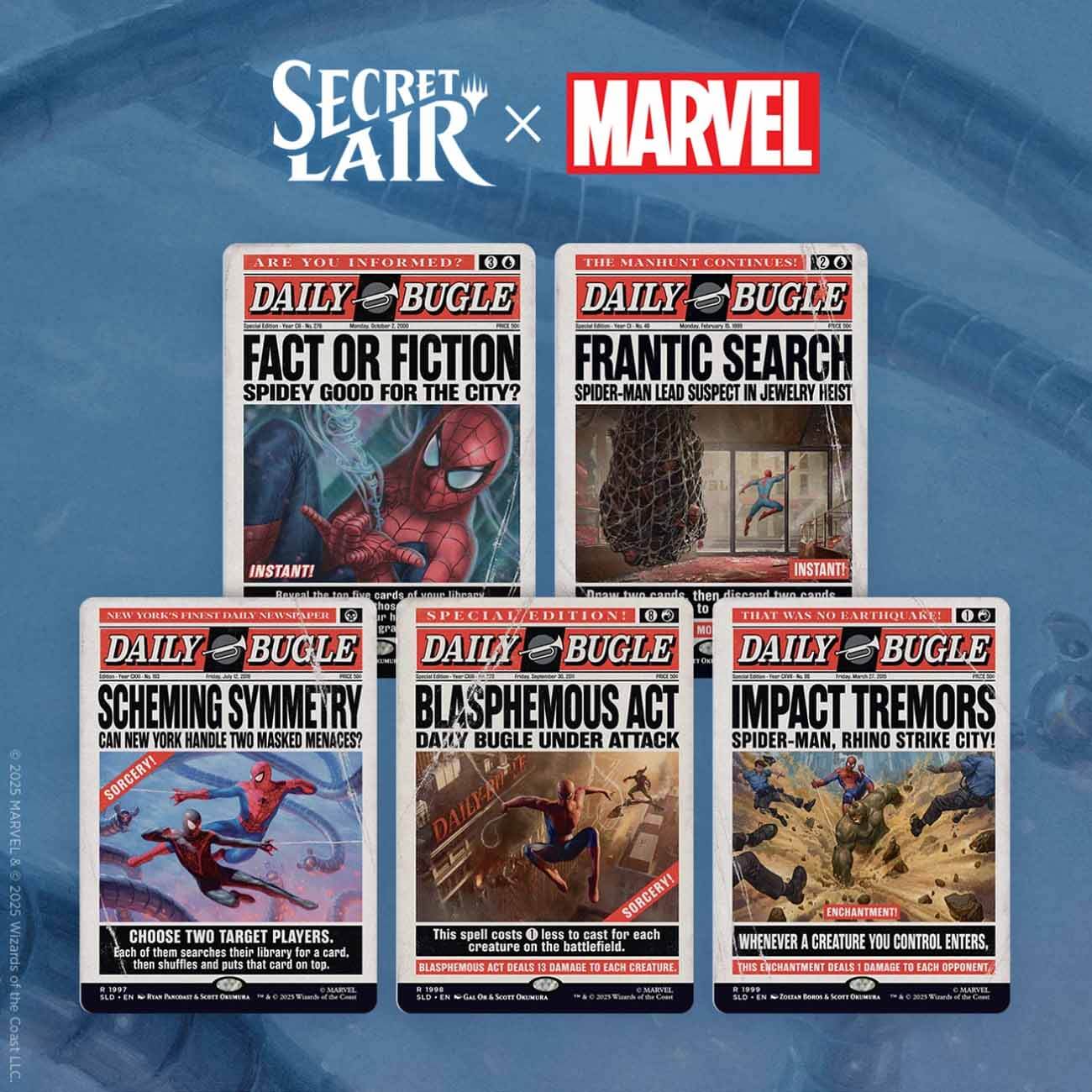Специальный набор ограниченного тиража Secret Lair x Marvel's Spider-Man: Daily Bugle Breaking News, коллаборация с культовой вселенной Marvel, включает 5 карт Magic: the Gathering (MTG / МТГ) на английском языке, каждая с уникальным полноформатным артом, стилизованным под газетную передовицу с изображением Человека-Паука: Fact or Fiction, Frantic Search, Scheming Symmetry, Blasphemous Act, Impact Tremors. Художники-авторы иллюстраций: Zoltan Boros, Javier Charro, Gal Or, Ryan Pancoast, Carissa Susilo и by Scott Okumura.