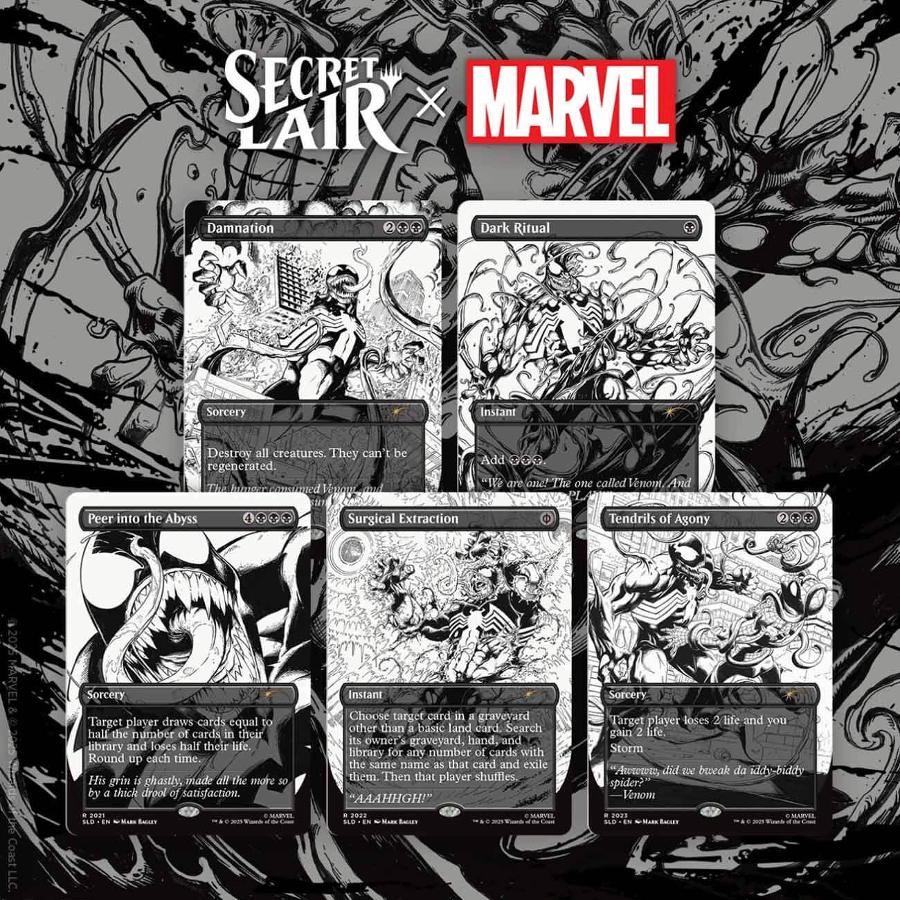 Специальный набор ограниченного тиража Secret Lair x Marvel's Spider-Man: Venom Unleashed (Inks), коллаборация с культовой вселенной Marvel, включает 5 карт Magic: the Gathering (MTG / МТГ) на английском языке, каждая с уникальным полноформатным артом, стилизованным под исполнение черными чернилами с отсылкой к персонажу Venom: Damnation, Dark Ritual, Peer into the Abyss, Surgical Extraction, Tendrils of Agony. Художник-автор иллюстраций: Mark Bagley.