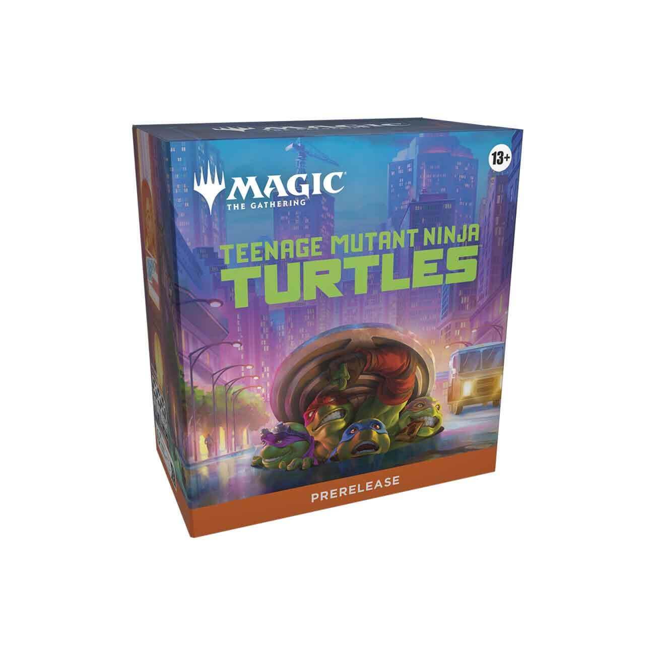 Пререлизный набор (prerelease pack) издания Teenage Mutant Ninja Turtles на английском языке игры Magic: the Gathering (MTG / МТГ) содержит 6 игровых бустеров (play boosters) одноименного издания, 1 кубик-счётчик жизней, 1 коробку для хранения карт с разделителем, 1 фойловую редкую или мифическую промо-карту с датой пререлиза.